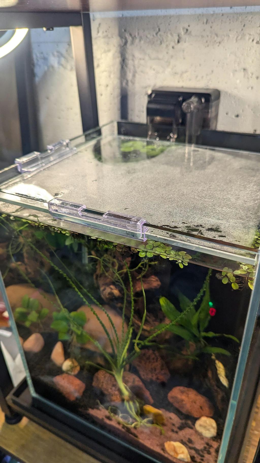 * Partial lid - it comes with three acrylic clips. With it covered on top, there is still little space left for you to put on a hang-on filter or hoses.